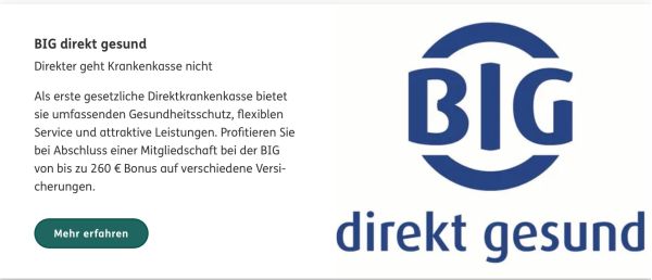 - 200 € Begrüßungsbonus: Als Neukunde bei "BIG direkt gesund" und gleichzeitiger Antragsteller des Krankentagegeldes der DKV erhältst du bis zu 200 € als Begrüßungsbonus.