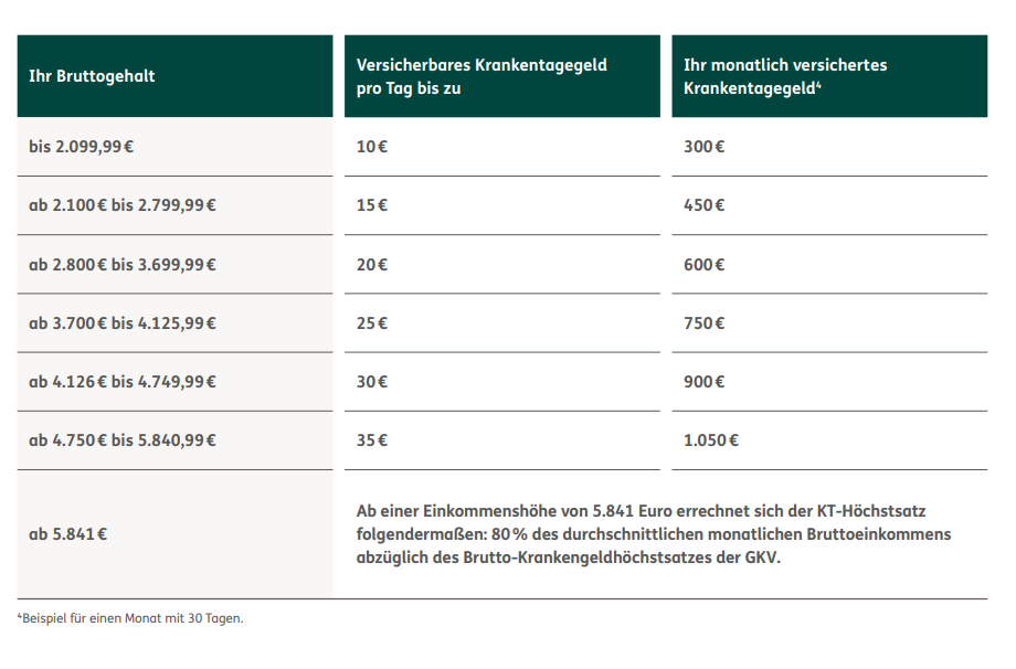 Versicherbare Tagegeldhöhe ab 5 Euro bis 35 Euro für pfl ichtversicherte Arbeitnehmer. Freiwillig versicherte Arbeitnehmer sogar bis 520 Euro.