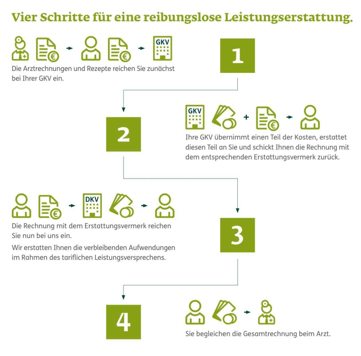 Kunden erhalten eine Rechnung von ihrem Arzt, die sie zunächst bei ihrer GKV zur Erstattung einreichen und anschließend bei der DKV. Die Gesamtrechnung wird vom Kunden beim Arzt beglichen.