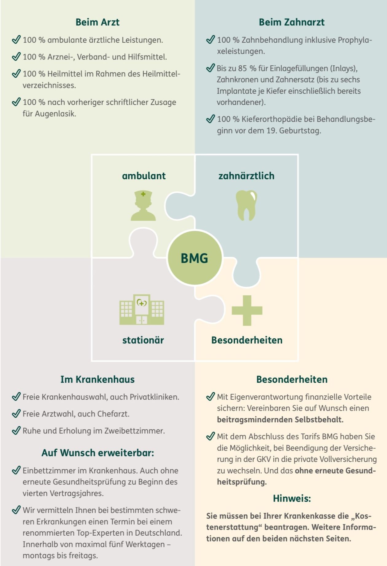 Jeder, der in der GKV freiwillig oder pflichtversichert ist, kann den Tarif BMG abschließen, vorausgesetzt, er hat bei seiner Krankenkasse eine Kostenerstattung für ärztliche Leistungen gewählt.
