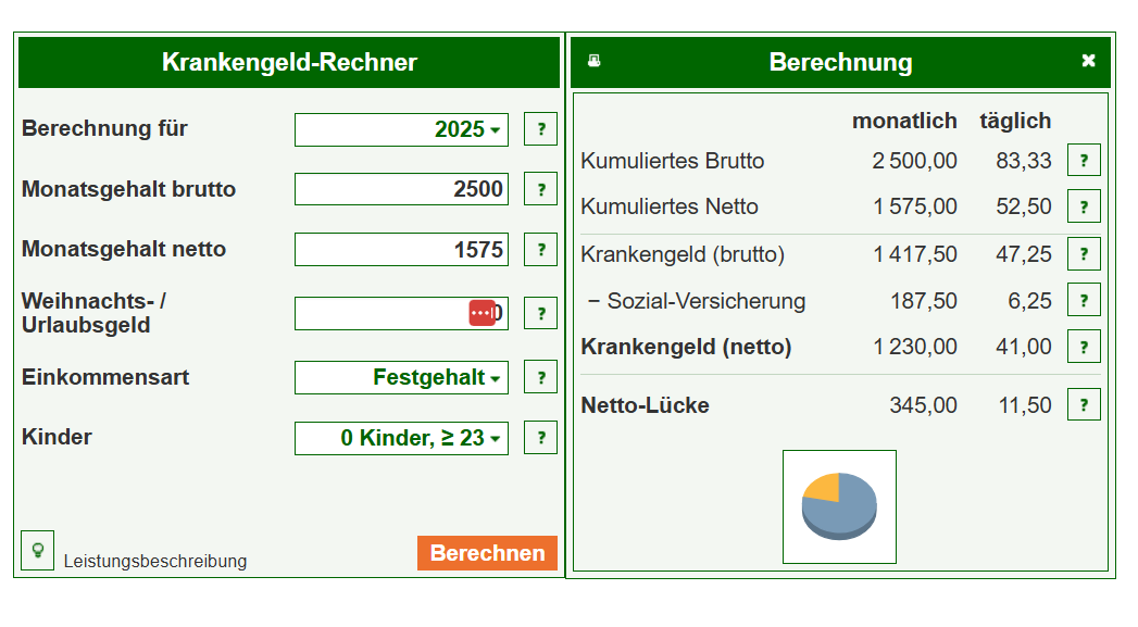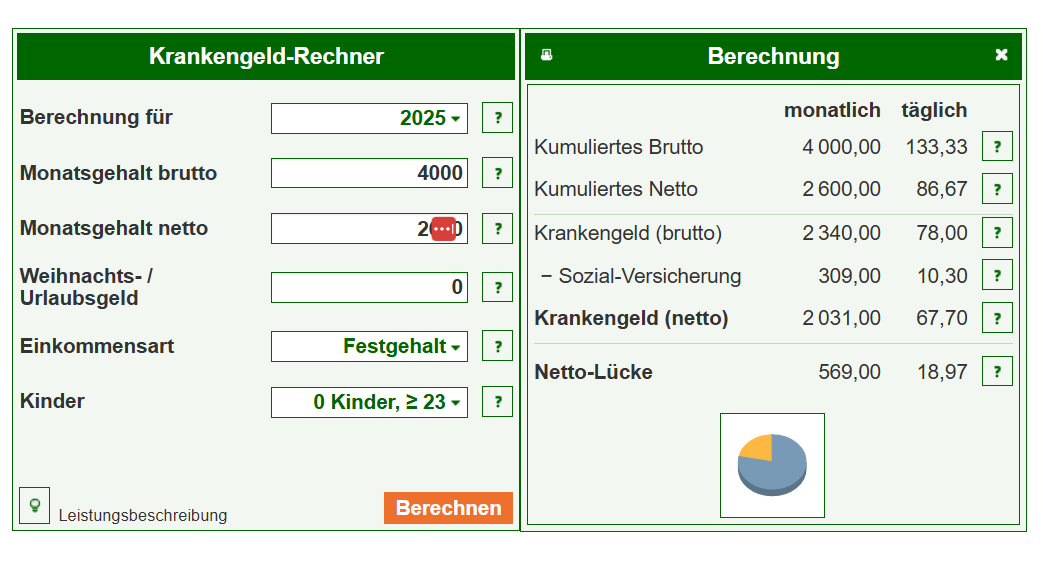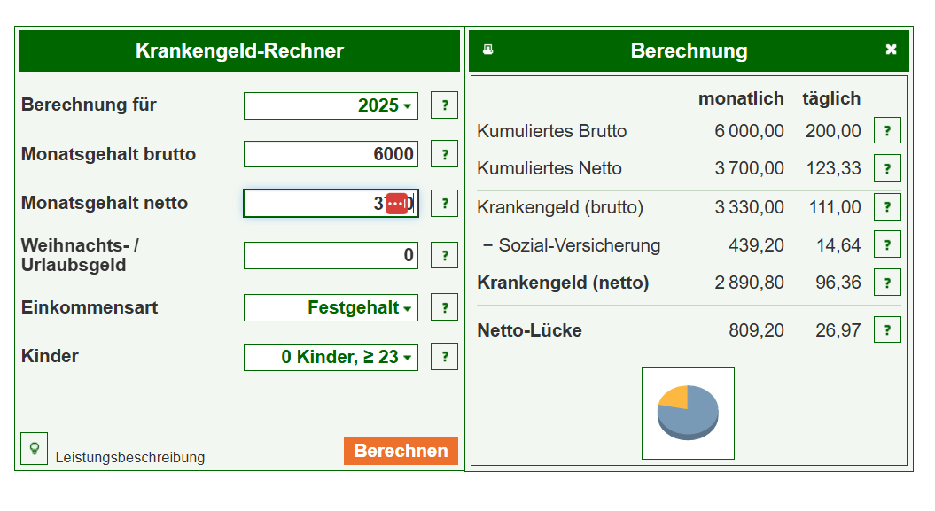 - Berechnen Sie Ihr individuelles Krankengeld anhand der oben genannten Formeln.